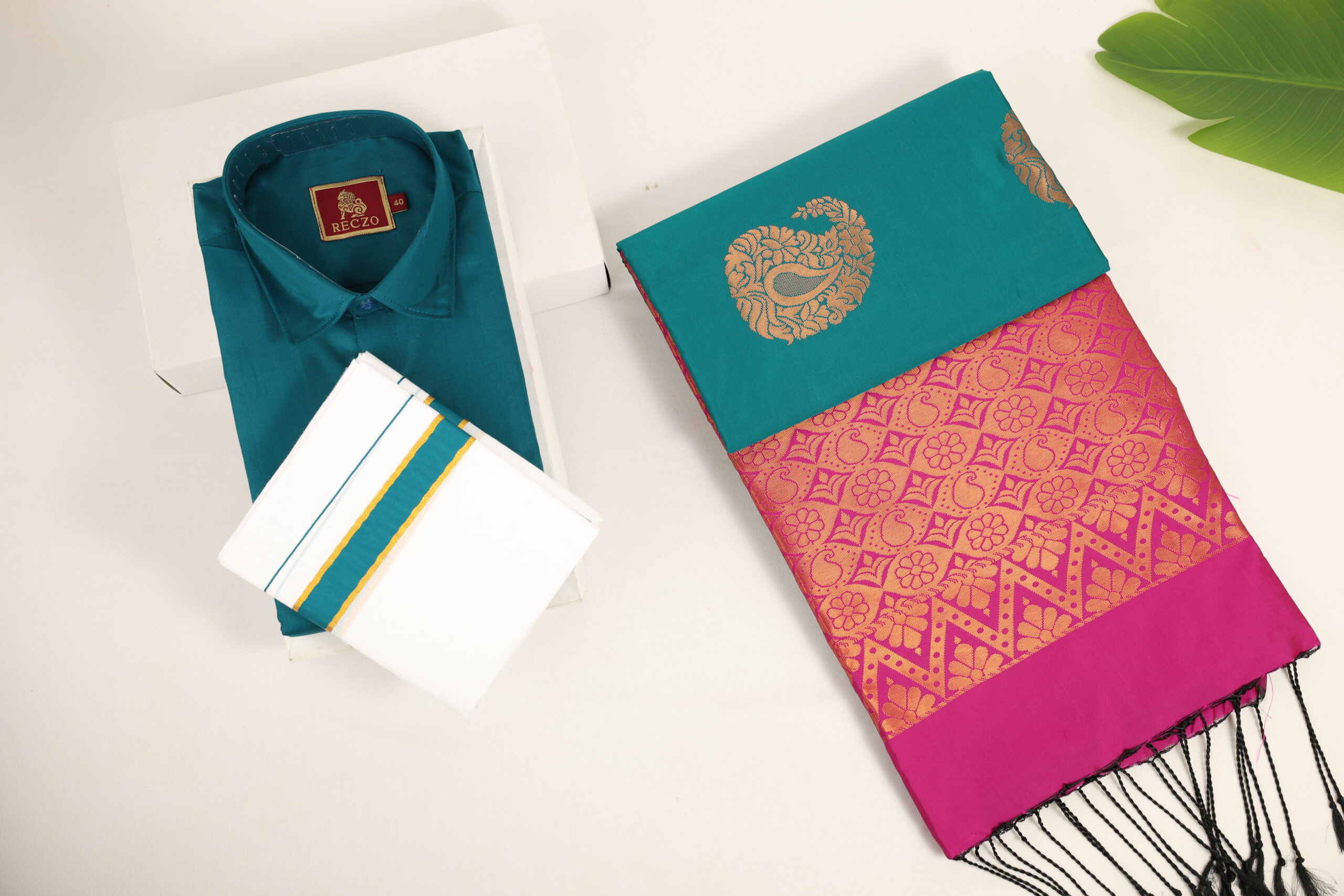Premium Silk Couple Combo Set – Shirt, Dhoti & Bridal Semi-Silk-Saree