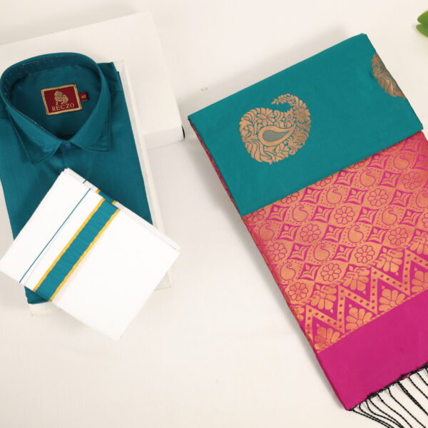 Premium Silk Couple Combo Set – Shirt, Dhoti & Bridal Semi-Silk-Saree